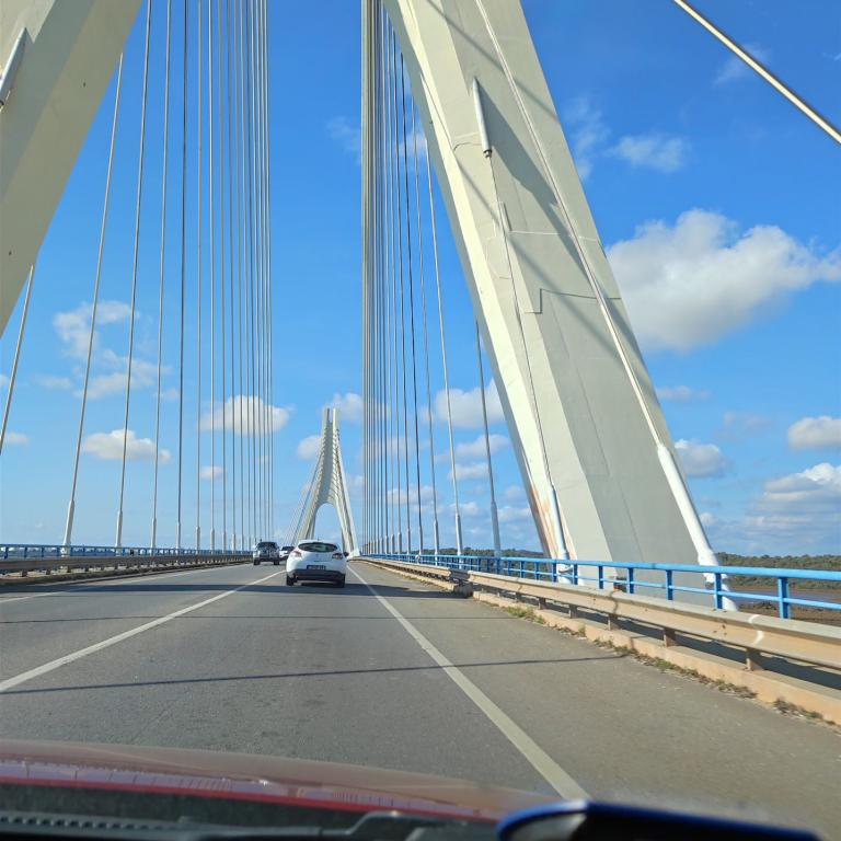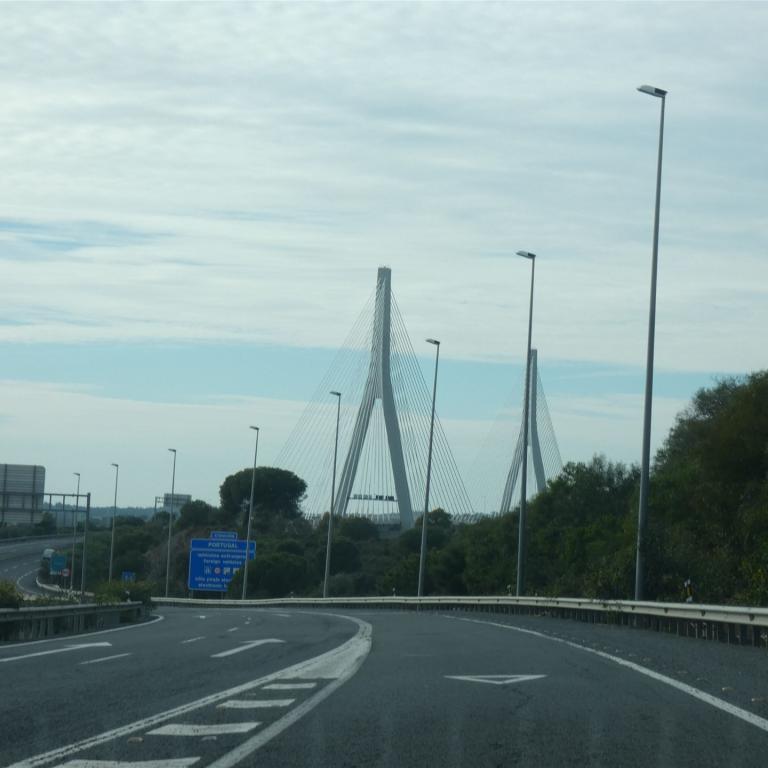 Um nach Portugal zu kommen, gibt es von hier aus zwei Möglichkeiten. Mit der Fähre oder über die Autobahn eine kostenpflichtige Brücke. Mit der Fähre sind wir beim letzten Besuch gefahren, was mit unserem Auto nicht so einfach war. Der Abstand und Winkel zwischen Rampe und unserem Auto war nicht optimal. Dieter musste sehr aufpassen, dass das Auto nicht aufsetzte. Deshalb klare Entscheidung, wir fahren über die Brücke.