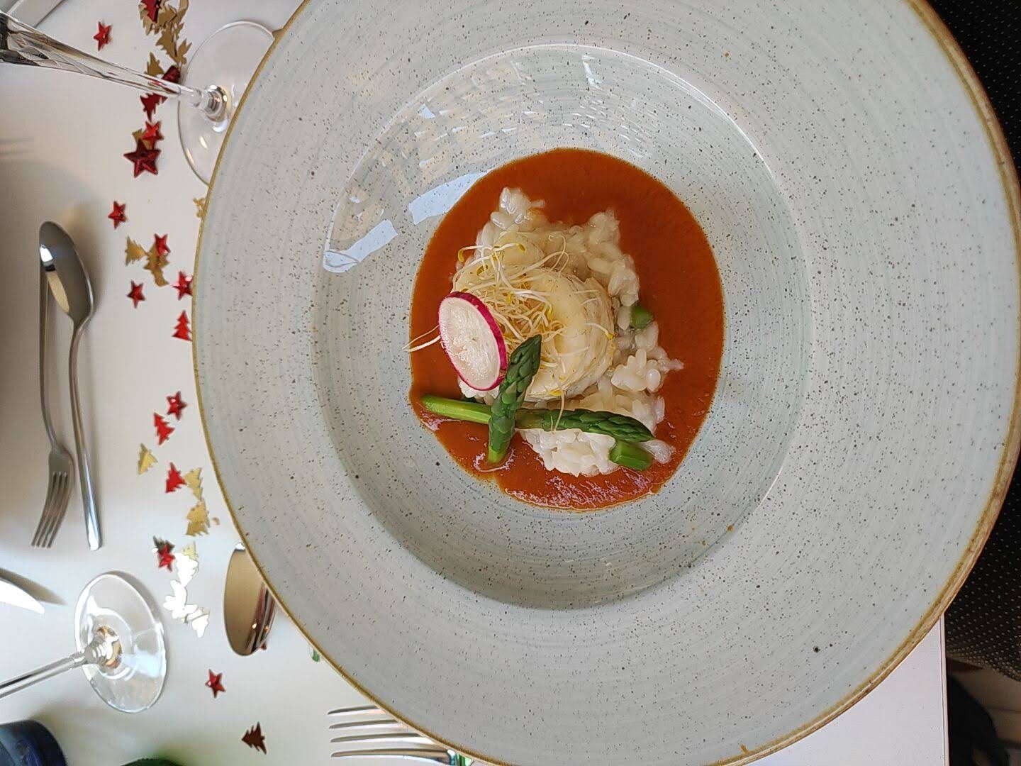 Nächster Gang ist ein Schollenfiletröllchen, dass auf einem Bett aus Spargelrisotto liegt und mit einer Tomaten-/Basilikumsoße umrandet ist. So kann es weiter gehen.