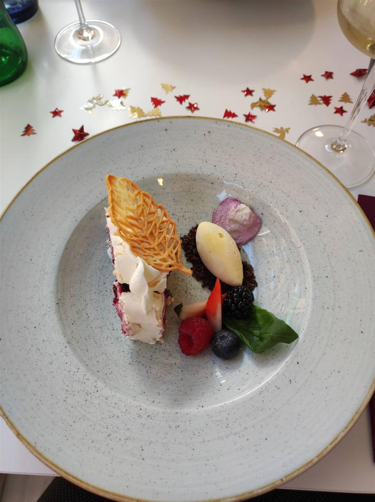 Zum Nachtisch gibt es ein Stück Mascarponerolle, die mit weißer Schokolade zubereitet und mit Brombeermus gefüllt ist. Dekoriert mit Zitroneneis und frischer Himbeere, Brombeere, Heidel- und Erdbeere.
