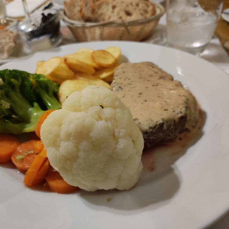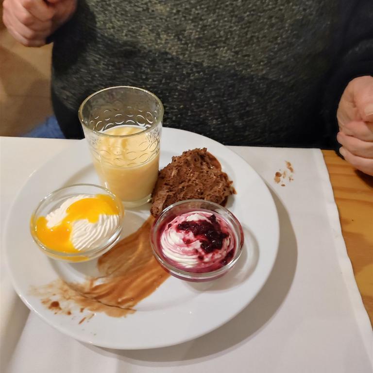 Der Nachtisch wird als Buffet angeboten. Kaffee rundet das Menü ab. Nachdem die Rechnung angefordert wurde, kommt noch die Frage nach einem Schnaps. Wer Trinkgeld geben möchte, kann das Geld in ein Kästchen legen, das auf den Tisch gestellt wird. Mit einer Rechnung über 80 € verlassen wir das Lokal.