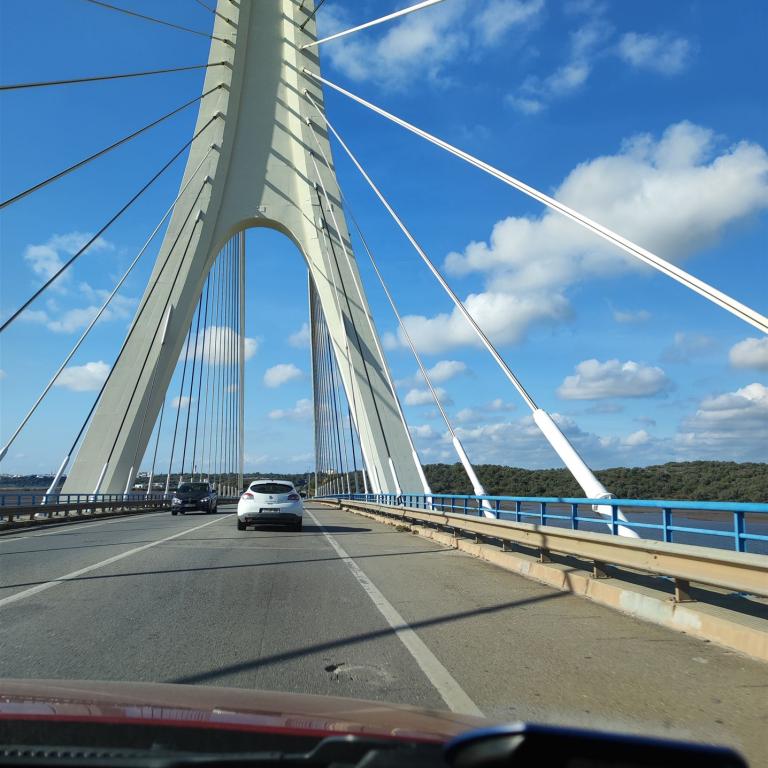 Um nach Portugal zu kommen, gibt es von hier aus zwei Möglichkeiten. Mit der Fähre oder über die Autobahn eine kostenpflichtige Brücke. Mit der Fähre sind wir beim letzten Besuch gefahren, was mit unserem Auto nicht so einfach war. Der Abstand und Winkel zwischen Rampe und unserem Auto war nicht optimal. Dieter musste sehr aufpassen, dass das Auto nicht aufsetzte. Deshalb klare Entscheidung, wir fahren über die Brücke.
