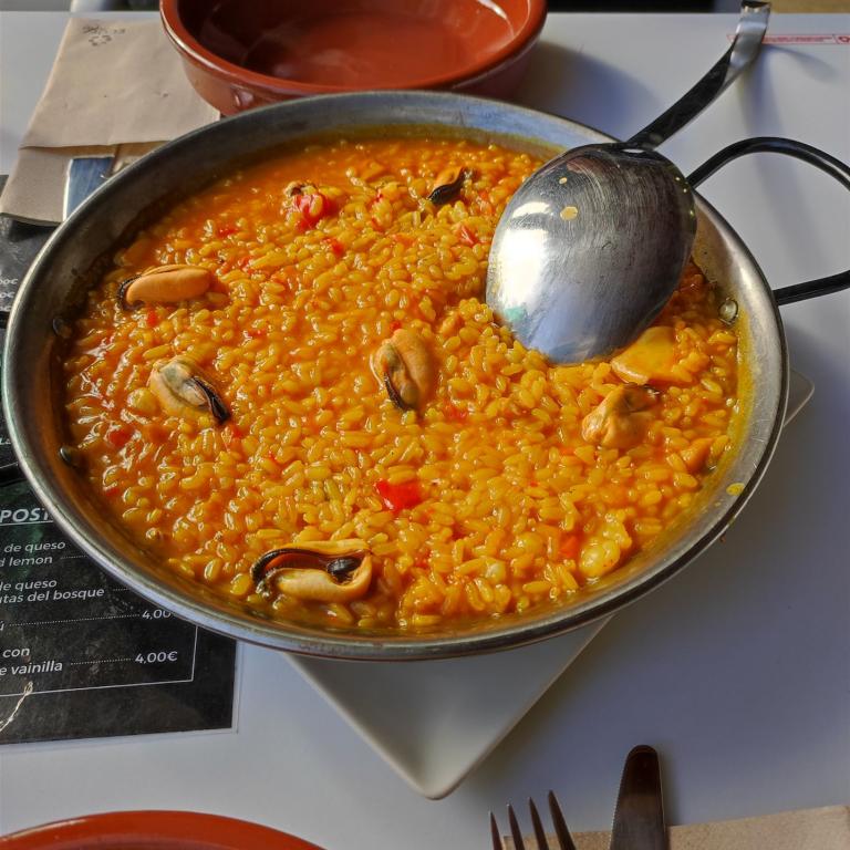 Was essen wir heute? Eins der Restaurants bietet Paella an, das ist heute das Ideale. Die Pella wird frisch zubereitet. Die Wartezeit ist im Sonnenschein gut zu überbrücken.