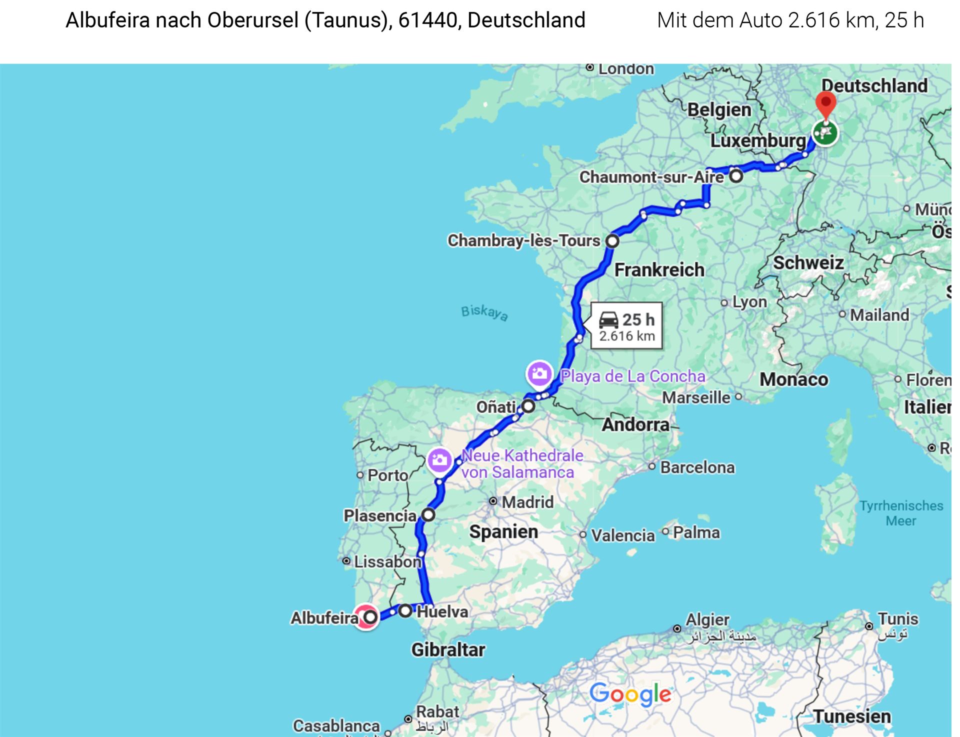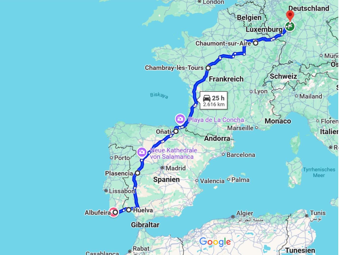 Von Albufeira nach Huelva, weiter bis Sevilla, abbiegen auf die E803 Richtung Merida, Caceres bis Plascencia. In Plascencia wird übernachtet.