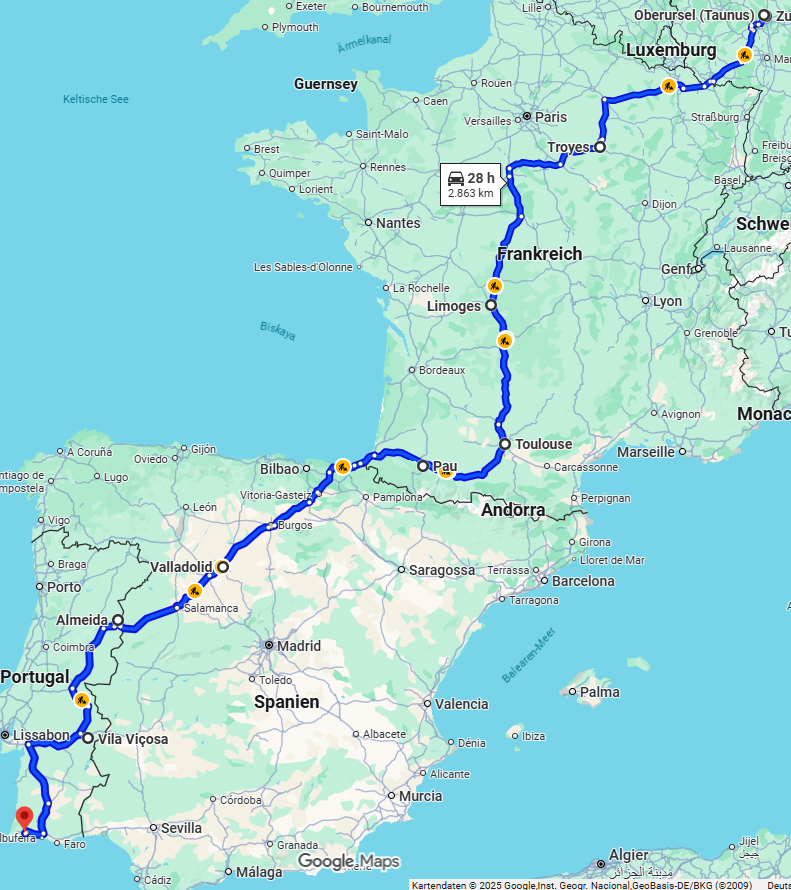 Auch dieses Jahr werden wir wieder mit unserem IONIQ nach Portugal fahren. Dieses Mal lassen wir uns etwas mehr Zeit und übernachten 6 mal. Auch die Strecke haben wir anders gewählt. Wir fahren in der Mitte Frankreichs nach Süden um dann entlang der Pyrenäen bis wir bei Bilbao / Santander Richtung Spanien abbiegen.