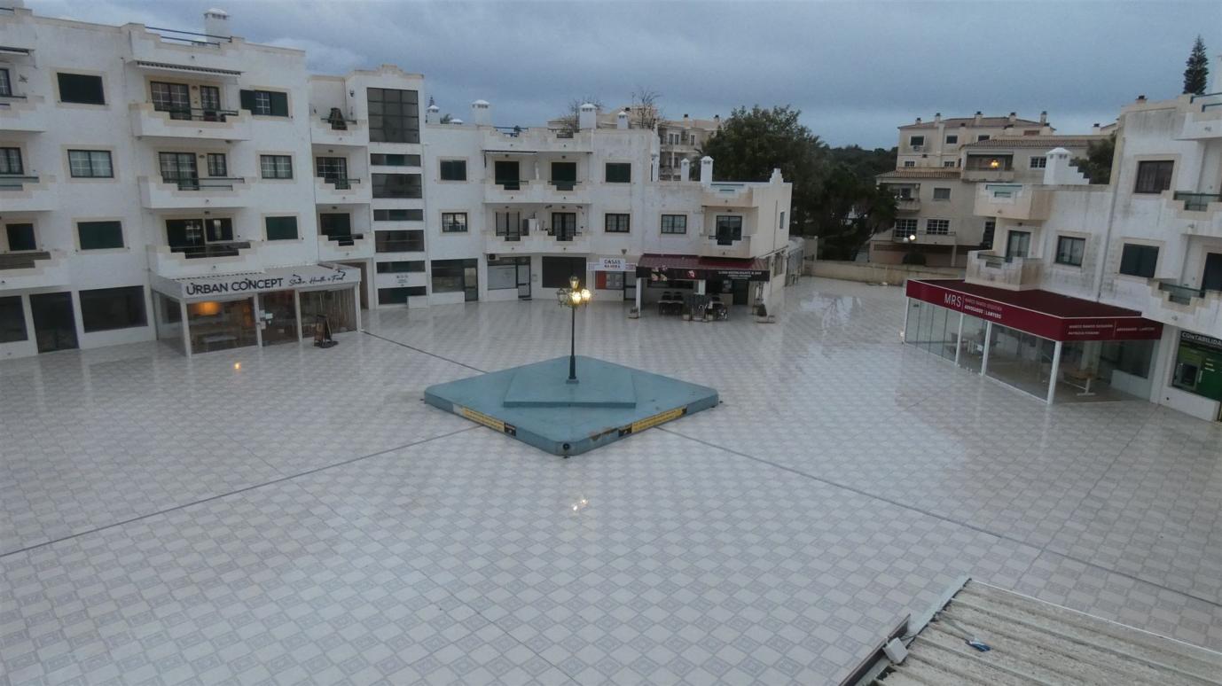 Von unserem Fenster aus sehen wir auf einen Platz, an dem sich Restaurants und Büros befinden.