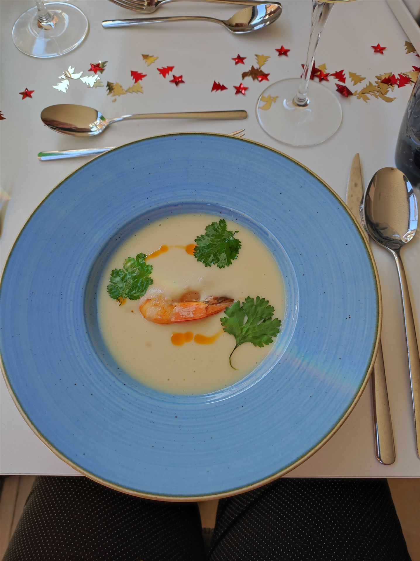 Gestartet wird das Menü mit einer dickeren Selleriesuppe, die mit einem gegrillten Shrimp und Shrimpöl garniert ist. Schon mal ein sehr leckerer Beginn.