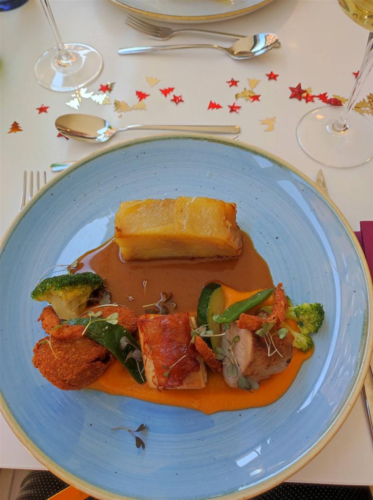 Nun kommt eine Triologie von Iberischem Schwein. Lende, Schweinebauch und ein paniertes Stückchen Schweinebraten. Dazu gibt es Kürbispüree und Lyonnaise Kartoffeln. So langsam passt nichts mehr in den Magen rein. Vor dem Nachtisch muss eine Pause sein.